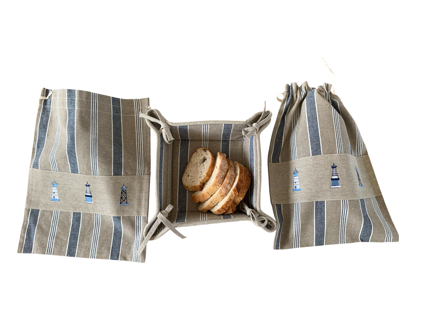 Nautical Embroidered Cotton Bread Bag and Bread Basket - Set of 3 - Sailing Embroidered